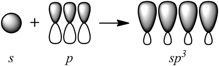 [그림] 1개 s 오비탈 + 3개 p 오비탈 → 4개 sp3 혼성 오비탈.