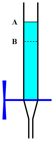 코크를 열어 2 mL만큼(A에서 B까지) 표준용액을 가했을 때,