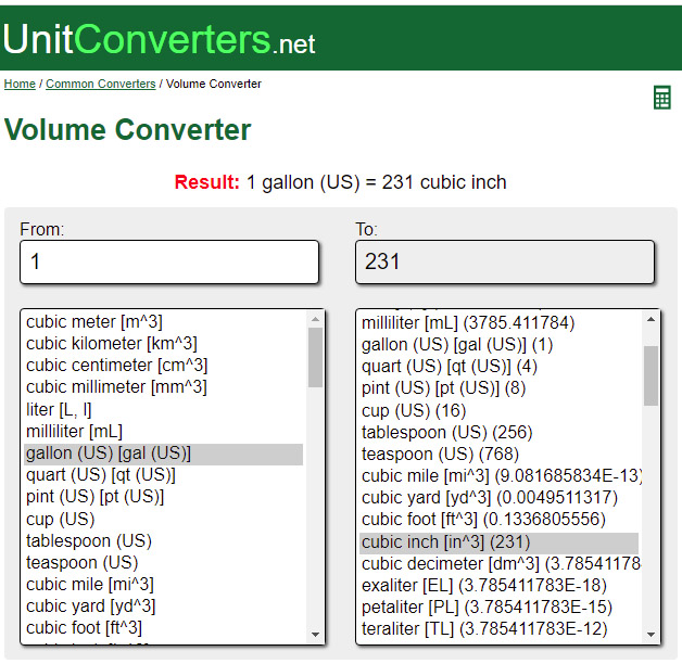 > 1 미국 액량 갤런 = 231 in^3 (exactly, 정확한 값)