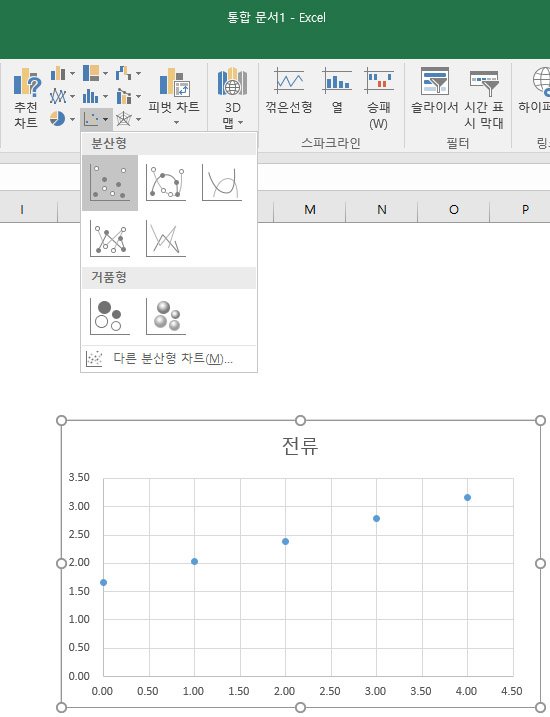 그림과 같이 점 모양의 [분산형] 차트를 선택한다.