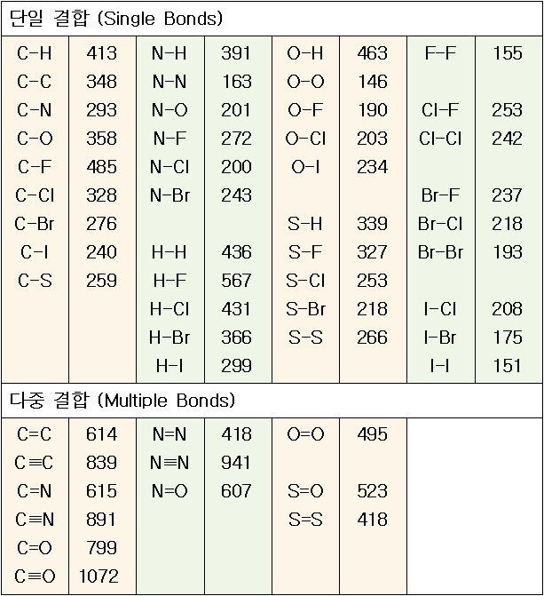 [도표] 평균 결합 엔탈피, Average Bond Enthalpies (kJ/mol)