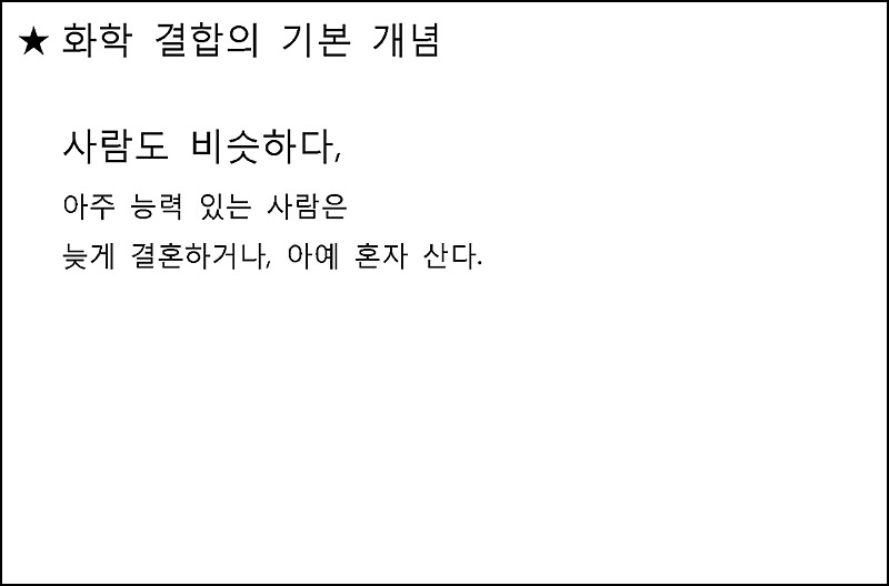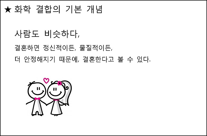 ⇨ 원자들은 8개의 원자가 전자를 가지려고, 전자를 얻거나 잃거나 혹은 공유한다.