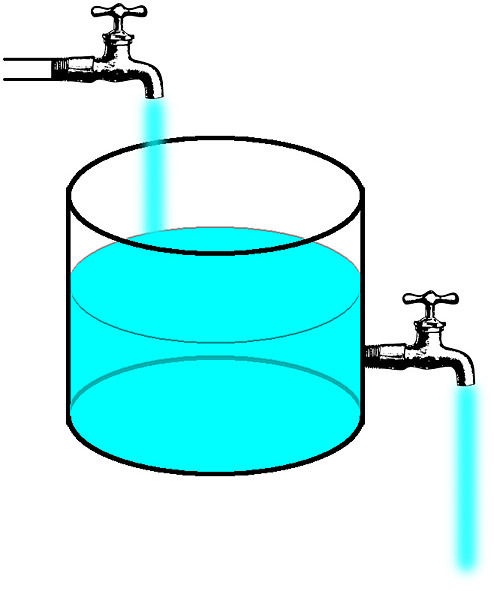 [그림] 동적 평형의 예. 공급되는 물의 양과 배출되는 물의 양이 같은 수조.