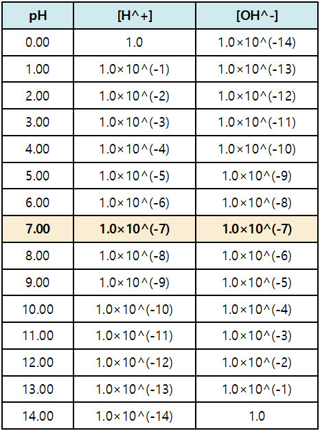 H^+ 이온의 몰농도와 OH^- 이온의 몰농도는 다음과 같기 때문에,