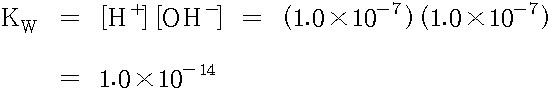 > Kw = [H^+] [OH^-] = (1.0×10^(-7)) (1.0×10^(-7)) = (1.0×10^(-14))