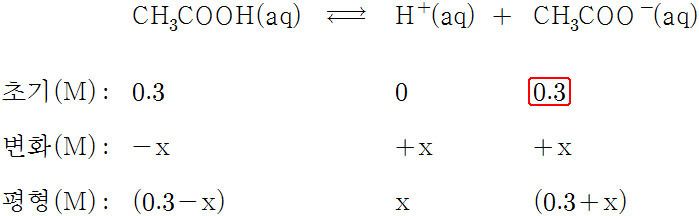 즉 초기 농도에서 아세트산 이온(CH3COO^-)의 농도가