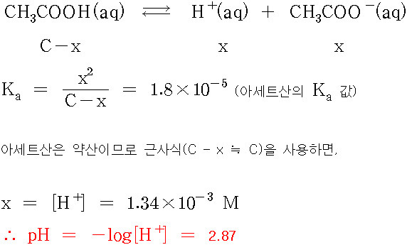 그러나 약산의 짝염기(CH3COO^-)의 가수분해 때문에,