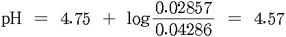 pH = 4.75 + log(0.0010 / 0.0015) = 4.57391...