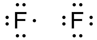 [그림] F 원자와 F^- 이온의 전자 점 루이스 구조.