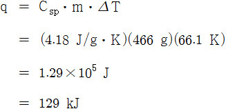 예) 물 466 g을 8.50℃에서 74.6℃까지 데웠다. 물이 흡수한 열량(kJ)은?