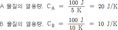 100 J의 열을 가했을 때, A는 25℃, B는 30℃가 되었다면,