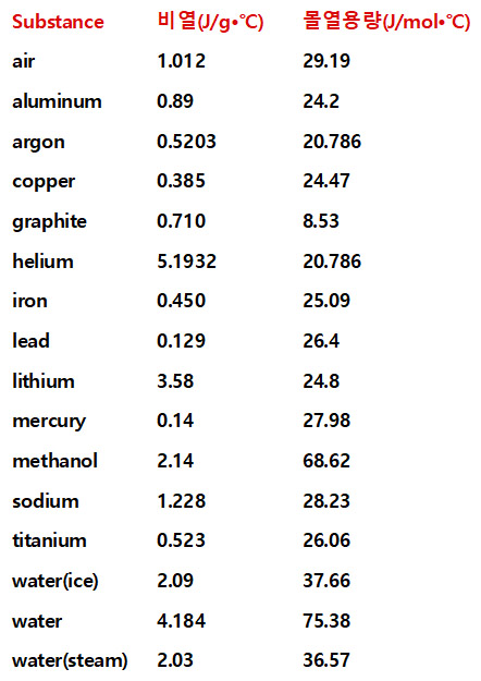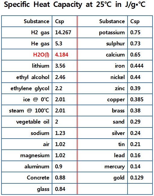 [ 관련 글 https://www.engineeringtoolbox.com/specific-heat-capacity-d_391.html ] Specific Heat of common Substances