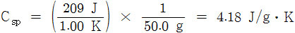 예) 물 50.0 g을 1.00 K 올리는데 209 J이 필요하다면, 물의 비열은?