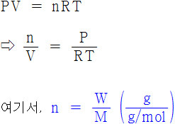 n/V = P/RT 식 양변에 몰질량(g/mol), M을 곱하면
