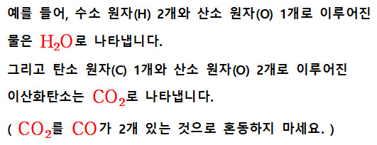 > 원소기호 뒤에 나오는 숫자는 아래첨자 숫자(작은 숫자)임을 알고 있어야 합니다.
