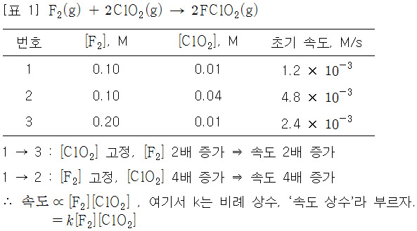 [표 1]에서, 반응물인 [F2] 또는 [ClO2]의 초기 농도를 달리하면서