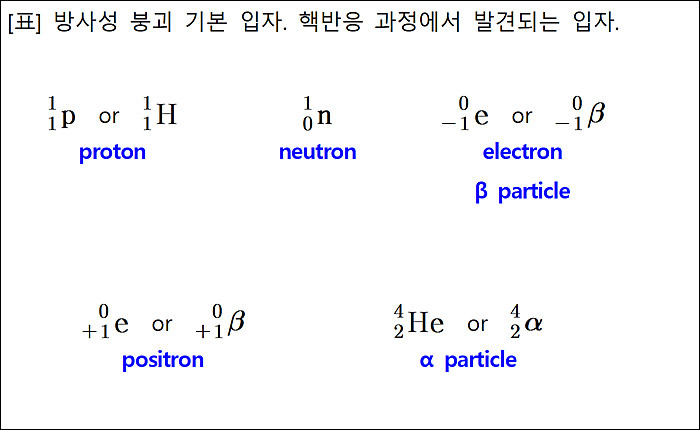 [표] 방사성 붕괴 기본 입자. 핵반응 과정에서 발견되는 입자