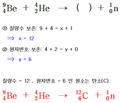 예제) Be의 원자핵에 α입자를 충격하였더니 중성자 n이 방출되었다.