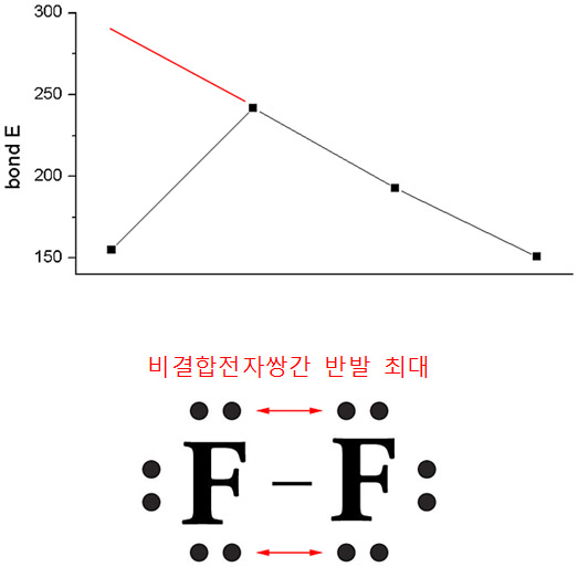 이 큰 반발력 때문에 F2의 결합 에너지는 Cl2 보다 작다.