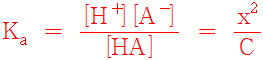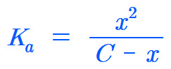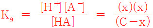 Ka = [H^+] [A^-] / [HA] = (x) (x) / (C–x)