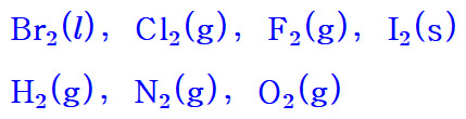 Br2(l), Cl2(g), F2(g), H2(g), I2(s), N2(g), O2(g)