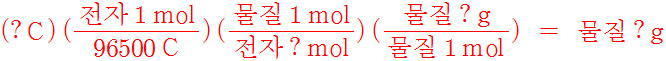 전자의 mol수를 물질의 mol수로, ... (1 mol e^- / 95600 C) (1 mol 물질 / ? mol e^-)