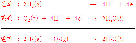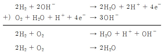 수소-산소 연료전지의 산화-환원 반응식 ( 염기성 전해질 용액 속 반응 )