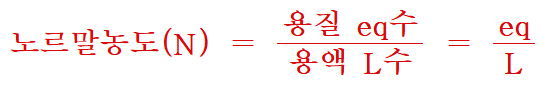 > 노르말농도 = 용질의 eq수 / 용액의 L수 = eq/L = N