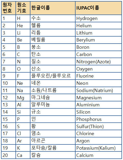 원소 주기율표, 원자번호 20번까지 외우기(암기법)