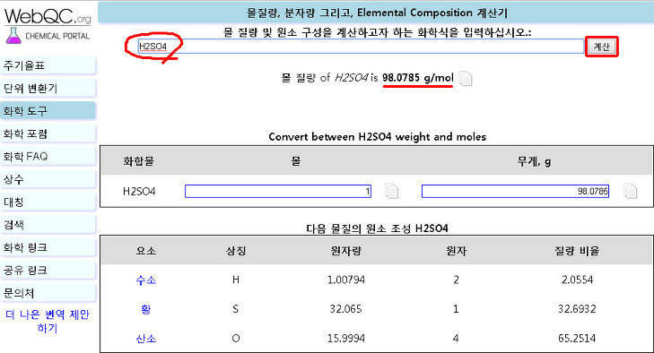 [ 참고: 몰질량 계산기 https://ko.webqc.org/mmcalc.php ] 몰질량 및 원소 구성을 계산하고자 하는 화학식을 입력하십시오.