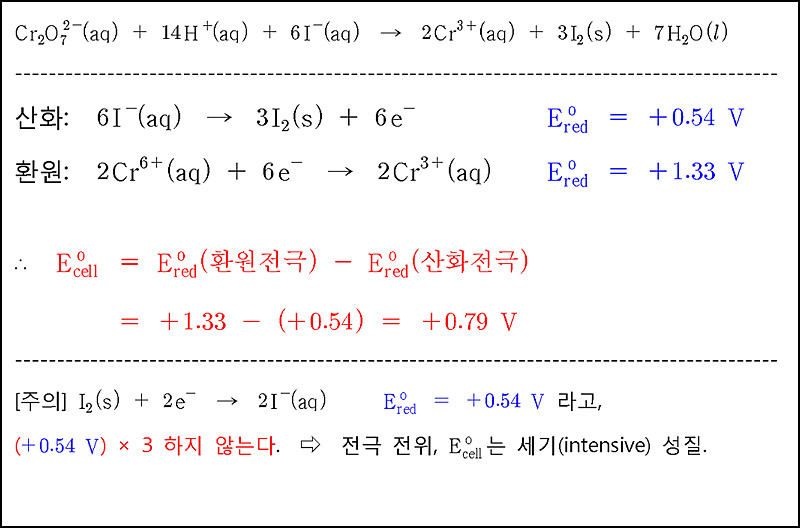 표준 환원 전위로부터 표준 기전력 계산. 전극 전위는 세기 성질