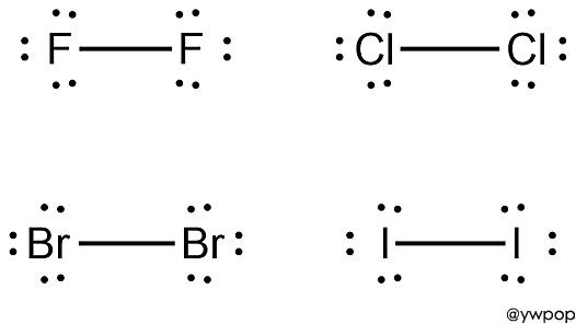 2개의 할로겐 원자가 공유결합한 이원자분자로 존재한다.