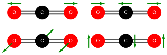 [ 그림 출처 Wikimedia ] Stretching and bending oscillations of the CO2 carbon dioxide molecule. Upper left: symmetric stretching. Upper right: antisymmetric stretching. Lower line: degenerate pair of bending modes.